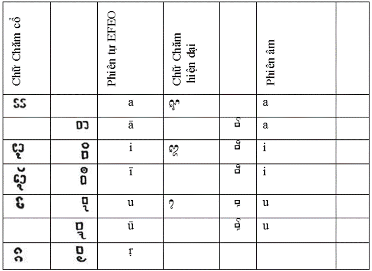Tham khảo 2. Bảng tham khảo nhóm nguyên âm chữ viết akhar Thrah Champa.