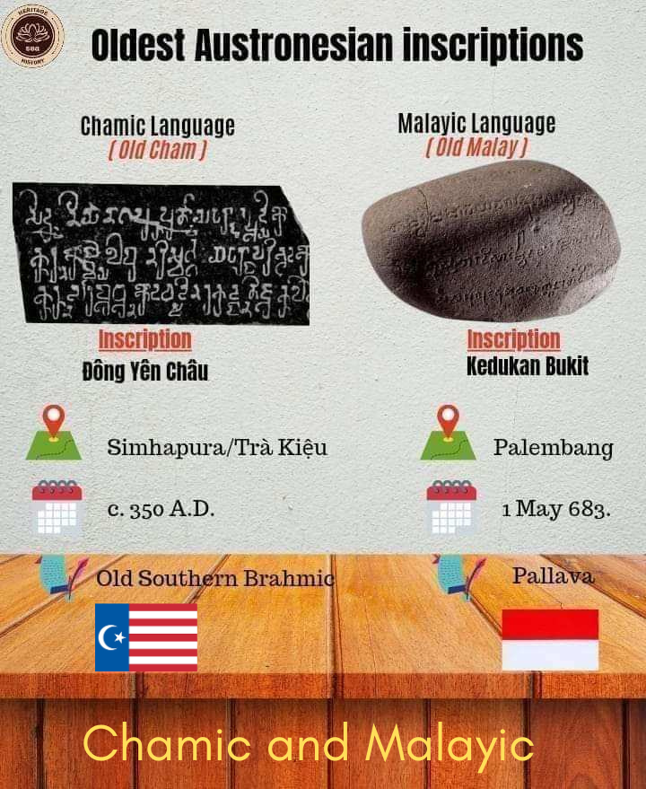 Hình 5. Chữ Champa cổ (Akhar Hayap ), ghi tiếng Cham (tiếng mẹ đẻ) trên bia ký Đông Yên Châu năm c.350 A.D (thế kỷ 4) và chữ viết Malay năm May 1, 683 (thế kỷ 7).