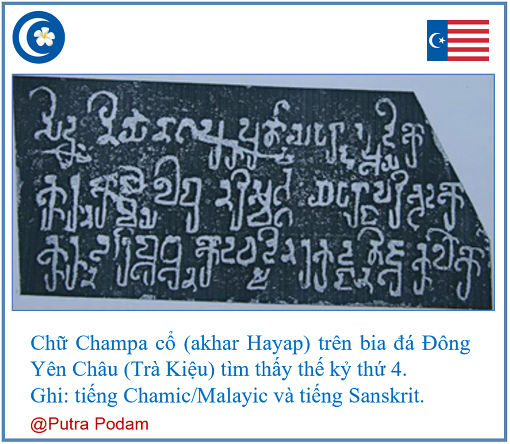 TIẾNG CHAMIC/MALAYIC: được tìm thấy trên bia ký ĐÔNG YÊN CHÂU (Trà Kiệu) vào thế kỉ thứ 4(Al-Ahmadi,1988; Coedes, 1939; Lafont, 2011). Dùng ghi tiếng Chamic/Malayic và Sanskrit.