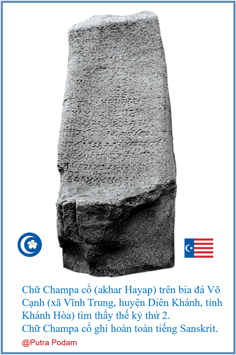 CHỮ... CHAMPA CỔ: được tìm thấy trên bia đá VÕ CẠNH (nay xã Vĩnh Trung, huyện Diên Khánh, tỉnh Khánh Hòa) vào thế kỷ thứ 2. Dùng ghi hoàn toàn tiếng Sanskrit (tiếng Phạn). (G. Coedes, 1939; Filliozat Jean, 1969).