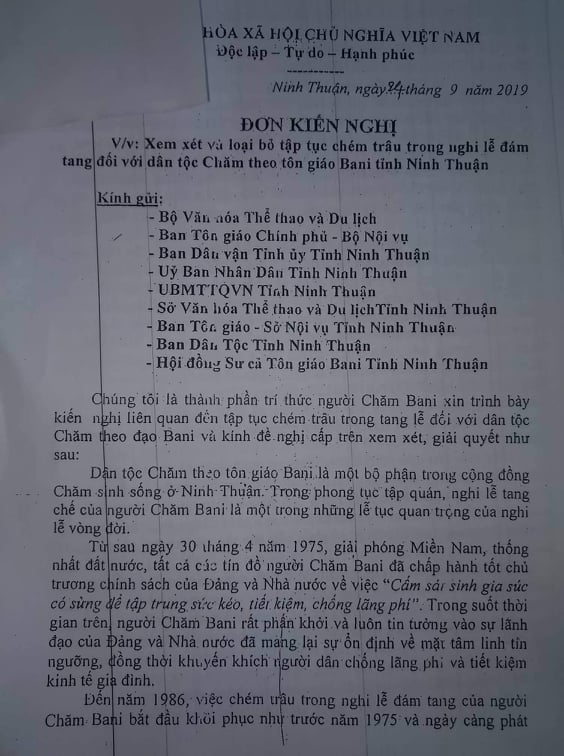 Hình 3. Đơn kiến nghị Thành Phần gửi Bộ VHTD_TT, Bộ Nội vụ - Ban Tôn giáo Chính phủ "cấm chém trâu trong đám tang người Chăm Bani"