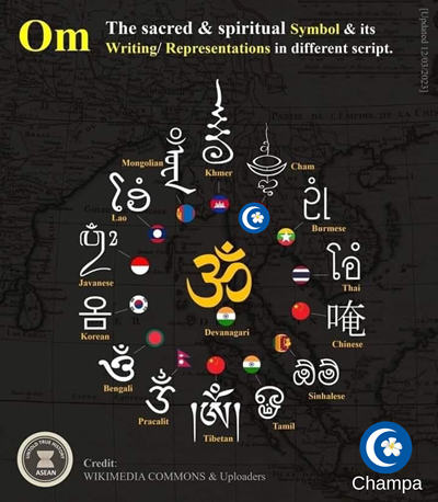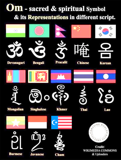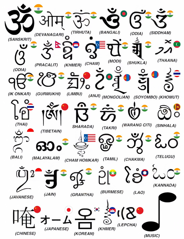 Hình 13. Om, Omka, Omkara Tập hợp các ký tự thiêng liêng “Om” (ॐ) được viết bằng nhiều loại chữ viết khác nhau trên khắp Nam Á, Đông Nam Á, Đông Á và dãy Himalaya. Ý nghĩa: Om (hay Aum) là âm thanh nguyên thủy và là thần chú linh thiêng nhất trong Ấn Độ giáo. Nó tượng trưng cho sự sáng tạo, bảo tồn và tan rã - chu kỳ tồn tại của vũ trụ. (The compilation of the sacred symbol “Om” (ॐ) written in different scripts across South Asia, Southeast Asia, East Asia, and the Himalayas. Meaning: Om (or Aum) is the primordial sound and the most sacred mantra in Hinduism. It symbolizes creation, preservation, and dissolution—the cosmic cycle of existence.)