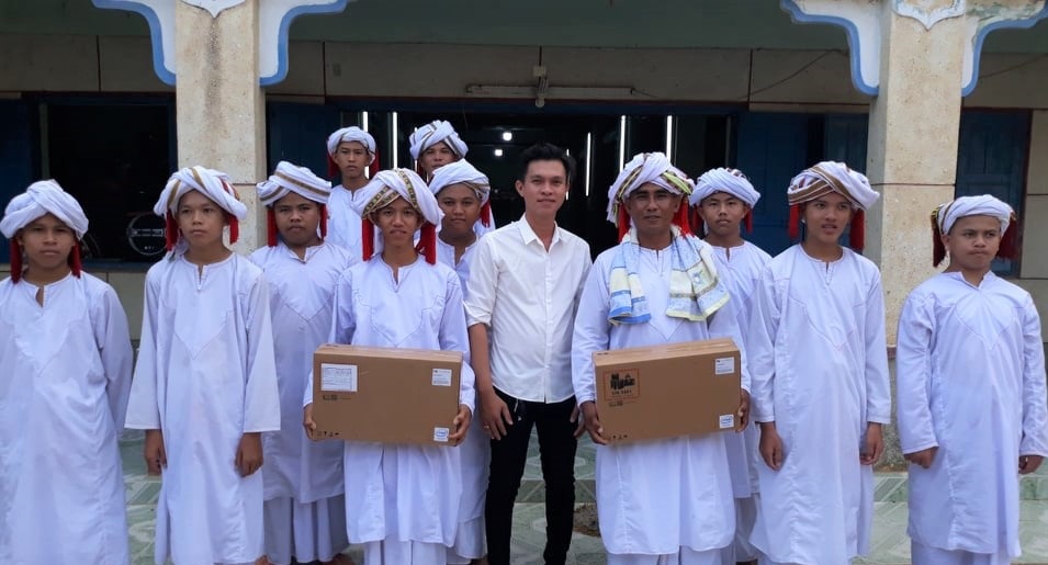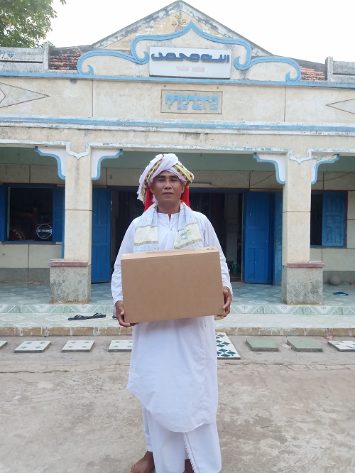 Hình 11. Imam. Champaka (Facebook: Champaka Imam)/ giữa: Chụp hình lưu niệm cùng một số giáo sĩ Acar trẻ tuổi, nhiệt tình, năng động. Đây là Tầng lớp thứ nhất (Acar)/ tầng lớp cao nhất trong hệ thống Awal Bani, chỉ duy nhất và trực tiếp thờ phượng Đấng tối cao Allah. Ngoài ra không thờ bất kỳ thần thánh hay YANG nào khác.