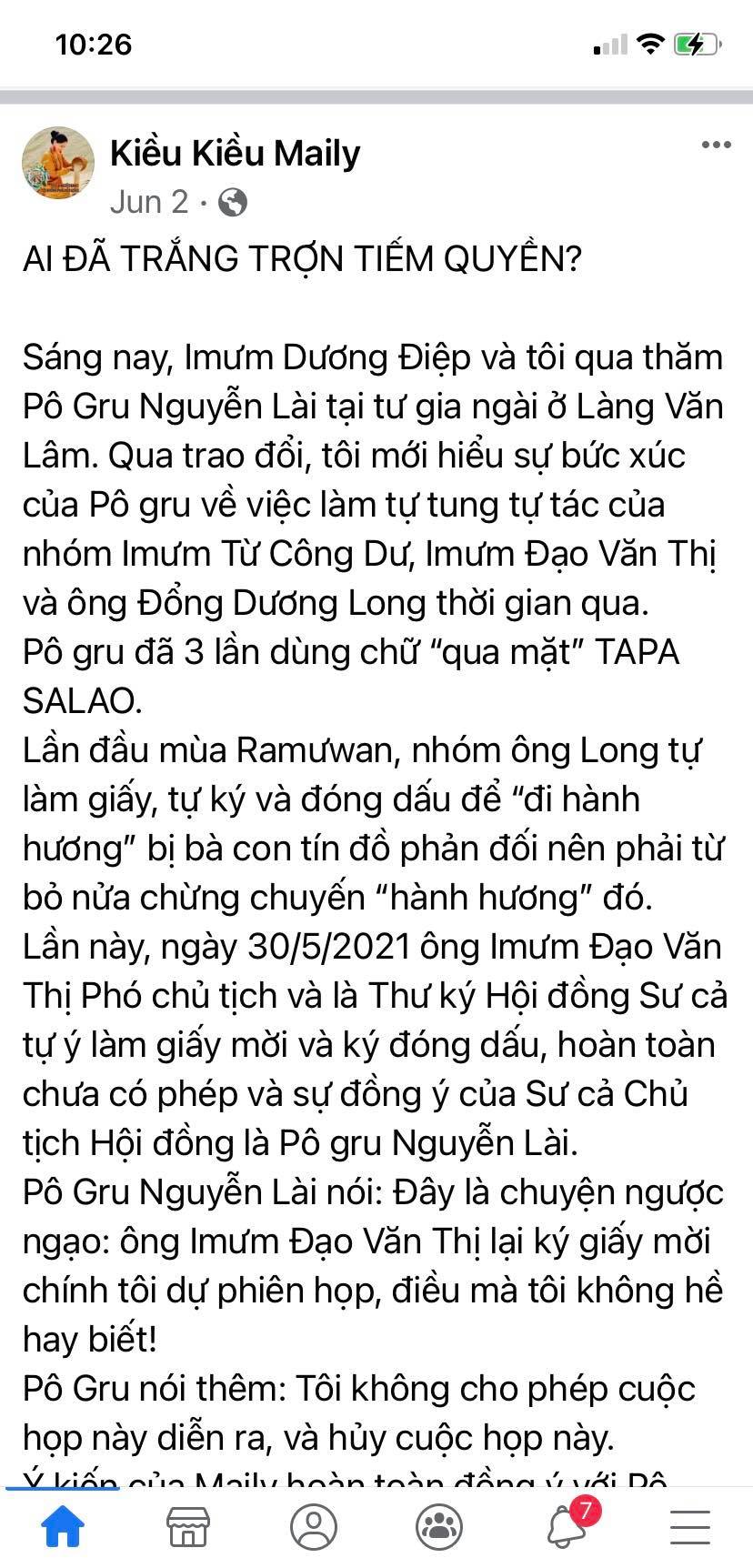 Trên Facebook của Kiều Kiều Maily đăng ngày 2/6/2021 nhằm kết tội Ban Chấp Hành HĐSC với tựa đề: “ AI ĐÃ TRĂNG TRỢN TIẾM QUYỀN”, trong đó kết tội “…ông Đổng Dương Long tự làm giấy tờ, tự ký đóng dấu để “đi hành hương” bị bà con tín đồ phản đối nên phải từ bỏ nữa chừng…..”, “…ông Imưm Đạo Văn Thị Phó chủ tịch và là Thư ký HĐSC tự ý làm giấy mời và ký đóng dấu, hoàn toàn chưa cho phép sự đồng ý của Sư cả Chủ tịch Nguyễn Lài…”