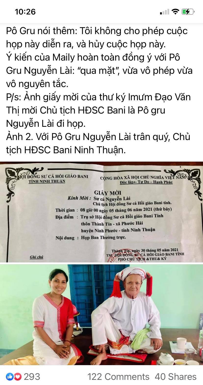 Đầu tháng 6/2021, tiếp tục nhóm Inrasara, Kiều Kiều Maily tiếp tục đăng bài và hình ảnh minh chứng đã làm việc với Sư cả Nguyễn Lài về kế hoạch xóa sổ HĐSC Hồi giáo Bani.