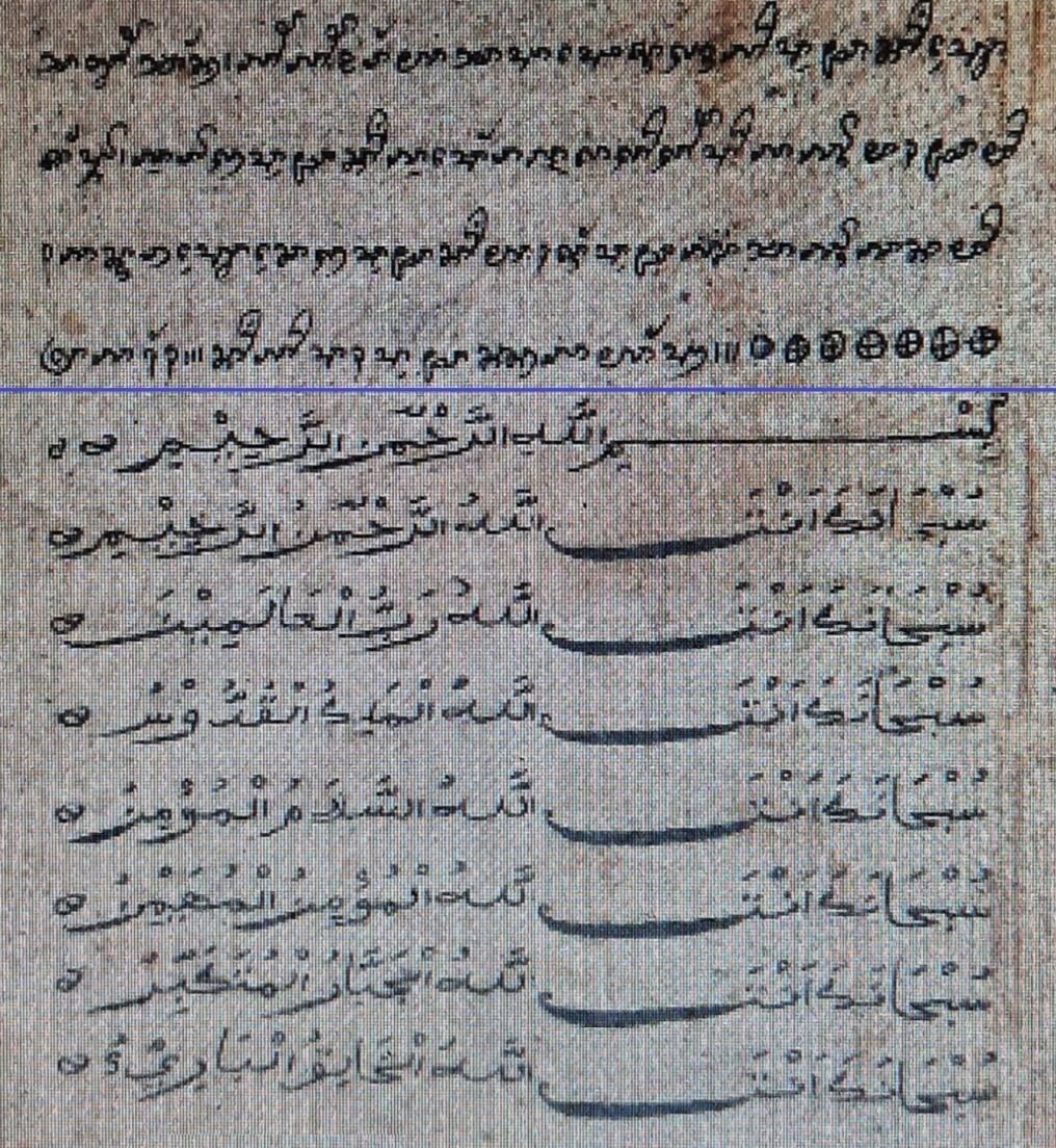 Hình 8. Giáo sĩ Acar rất ít khi dùng Jawi Chăm mà thường dùng Thrah Chăm để giải thích nội dung trong Thiên Kinh Koran (chữ Ả Rập – Arabic). Trong Hình 8 có 4 hàng trên là lời giải thích được viết Thrah Chăm, các dòng còn lại là chữ Ả Rập (Arabic)