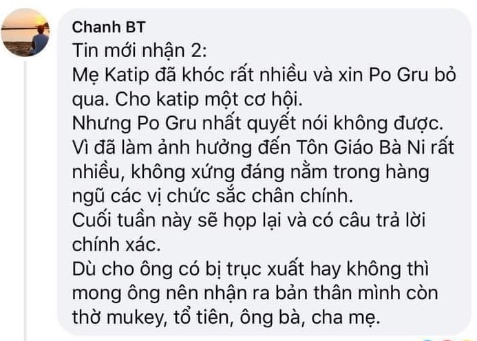 Theo chúng tôi được biết, gia đình và người thân của giáo sĩ Katip Từ Công Tấn đang chuẩn bị hồ sơ để kiện Thông Minh Chánh về hành vi bịa đặt, vu khống làm ảnh hưởng đến danh dự theo luật an ninh mạng Việt Nam.