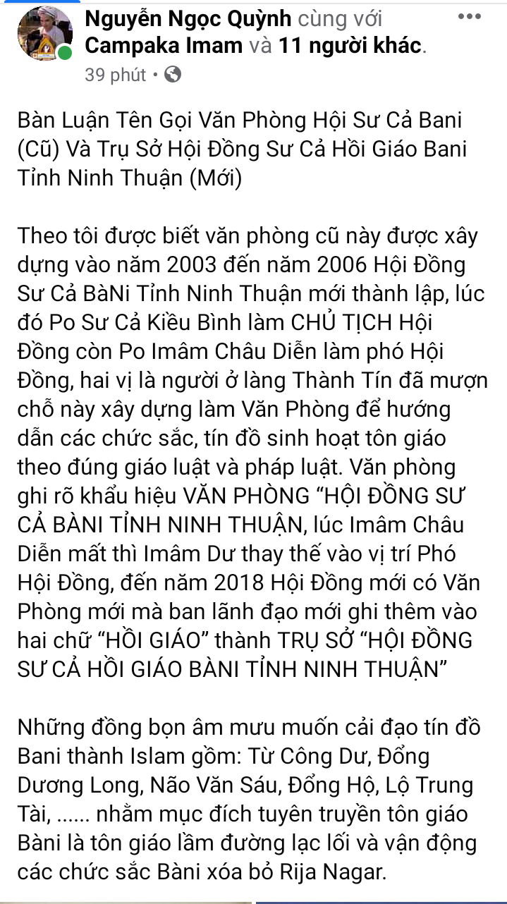 Từ khi bị phế truất ra khỏi hàng ngũ chức sắc, Nguyễn Ngọc Quỳnh trở thành tay sai của Ts. Thành Phần, tích cực đi kích động tín đồ Bani Awal vu cáo Hội đồng Sư cả Hồi giáo Bani Ninh Thuận là tổ chức vi phạm quyền tự do tôn giáo với âm mưu xóa tôn giáo Bani (không biết tôn giáo Bani công nhận từ năm nào mà nhóm tuyên tuyền Chính phủ xóa tôn giáo Bani?). Nhận chỉ thị của Ts. Thành Phần, Nguyễn Ngọc Quỳnh xúc phạm phỉ báng một số vị thành viên của Hội đồng Sư cả Hồi giáo Bani Ninh Thuận là những “đồng bọn âm mưu muốn cải đạo tín đồ Bani thành Islam gồm: Từ Công Dư, Đổng Dương Long, Não Văn Sáu, Đổng Hộ, Lộ Trung Tài, ...... nhằm mục đích tuyên truyền tôn giáo Bàni là tôn giáo lầm đường lạc lối và vận động các chức sắc Bani xóa bỏ Rija Nagar và là tay sai của bọn ngoại đạo chứ không ai khác, phải chăng ngoài sự hoang tưởng quá độ, Họ còn vẽ đường cho Hưu chạy, hay xúi dục cho ngoại đạo chửi rủa sỉ nhục đạo Bani? Chả lẽ hơn 45.000 tín đồ Bani khoanh tay để yên, ... (Nguyễn Ngọc Quỳnh đăng tải trên facebook cá nhân, vào ngày 30 tháng 7 năm 2021) .