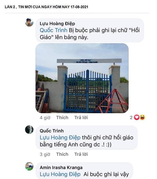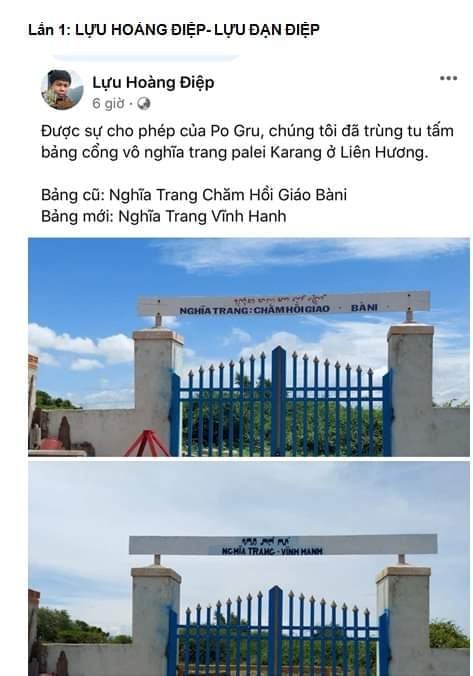 Hôm nay Lựu Hoàng Điệp tiếp tục trở lại chiến trường theo sự chỉ đạo của Ts.Thành Phần, lừa đảo Pô gru Sang Magik Karang để tu sữa bảng hiệu, nhưng Lựu Hoàng Điệp gỡ bỏ bảng hiệu nghĩa trang Hồi giáo Bani ở Vĩnh hanh tiến tới gỡ bỏ bảng hiệu Thánh đường Hồi giáo Bani Vĩnh Hanh. Trao đổi với chúng tôi, Pô gru Đàng Lao là cả sư chủ trì Thánh đường Vĩnh hanh cho biết : “Lựu Hoàng Điệp chỉ xin phép chúng tôi tu sữa bảng nghĩa trang cho đẹp và khang trang, không ngờ Lựu Hoàng Điệp lừa đảo chúng tôi phá bỏ bảng hiệu nghĩa trang Hồi giáo Bani ở Vĩnh Hanh. Ban bổn đạo Thánh đường Hồi giáo Bani Vĩnh hanh đang làm đơn tố cáo hành vi Lựu Hoàng Điệp đến công an Tuy phong xử lý theo pháp luật".
