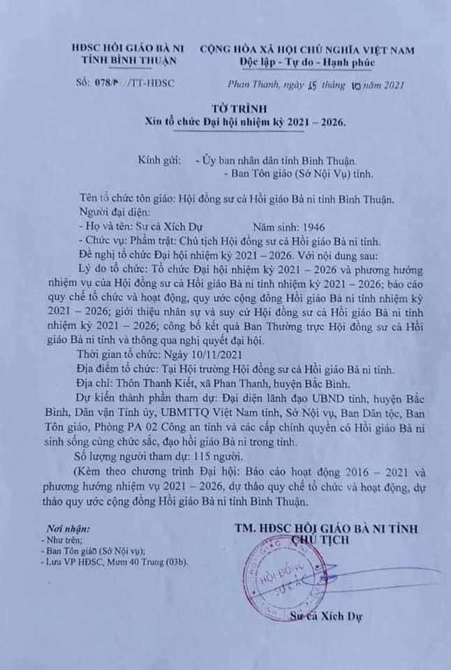 Theo tờ trình Số:078B/TT-HĐSC của Hội đồng Sư cả Hồi giáo Bani ngày 15/10/2021 về việc tổ chức Đại hội nhiệm kỳ 2021-2026.