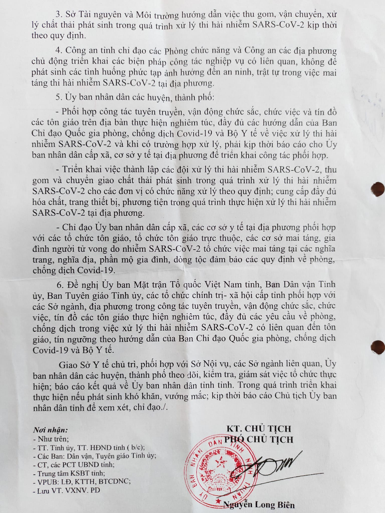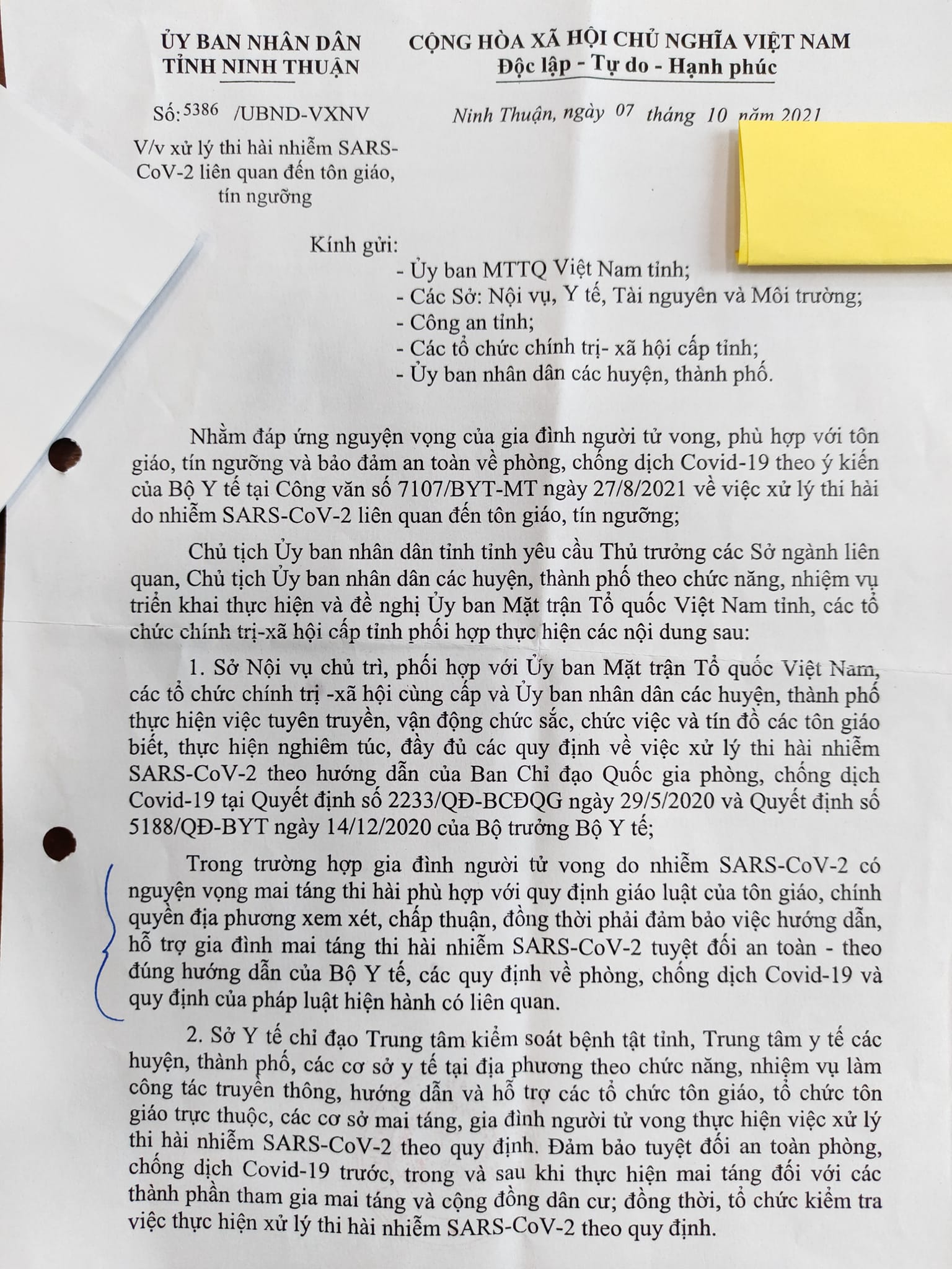 Ngày 07 tháng 10 năm 2021, UBND tỉnh Ninh Thuận ra công văn số 5386/UBND-VXNV, về việc xử lý thi hài nhiễm Covid-19 liên quan đến tín ngưỡng tôn giáo. Nội dung công văn ghi rõ: “Trong trường hợp gia đình người tử vong nhiễm Covid-19 có nguyện vọng mai táng thi hài phù hợp với qui định giáo luật tôn giáo, chính quyền địa phương xem xét chấp thuận, đồng thời phải hướng dẫn gia đình mai táng thi hài nhiễm Covid-19 tuyệt đối an toàn theo đúng hướng dẫn của Bộ Y tế, các qui đinh về phòng chống dịch Covid-19 và các qui định pháp luật có liên quan".