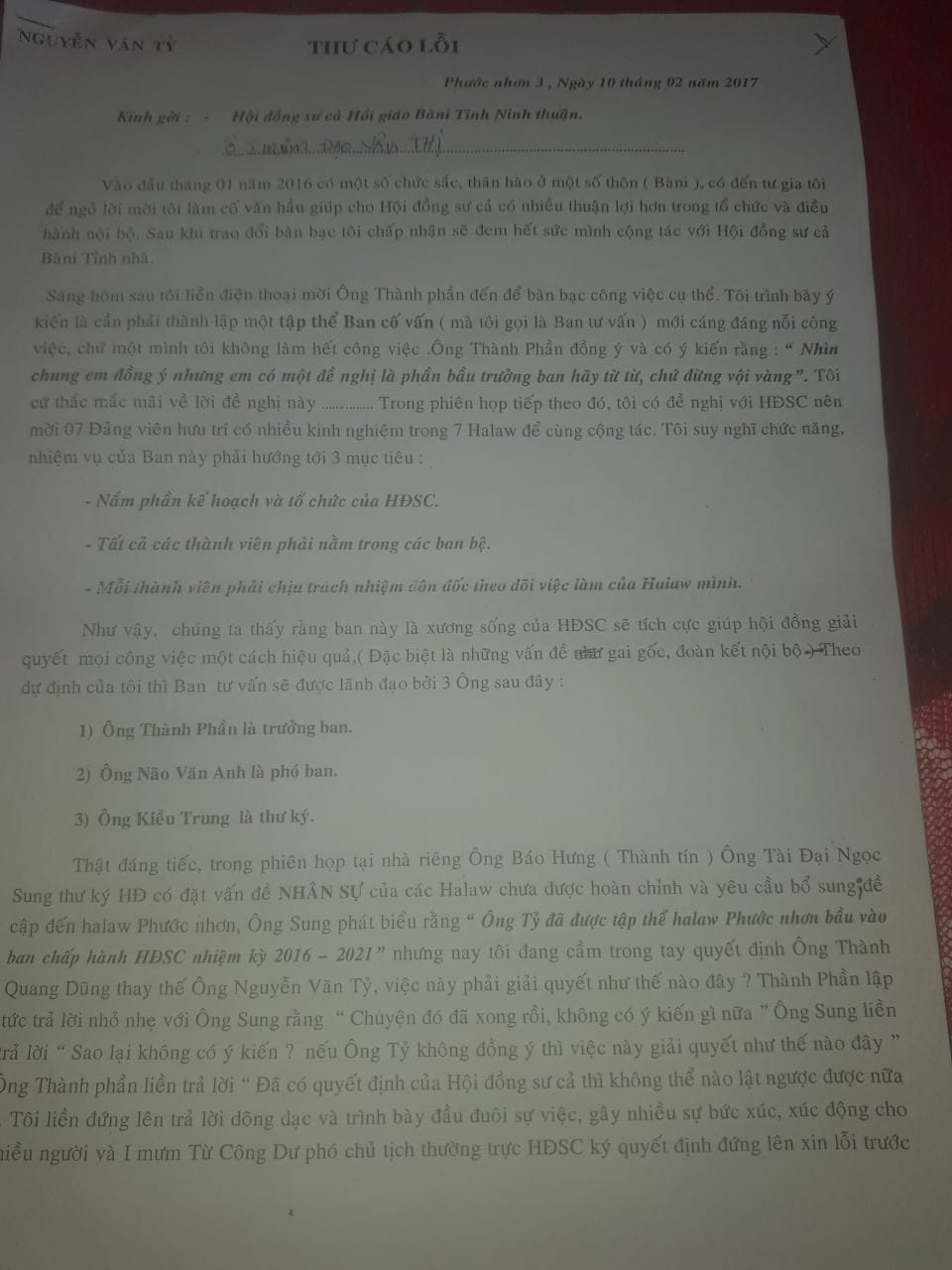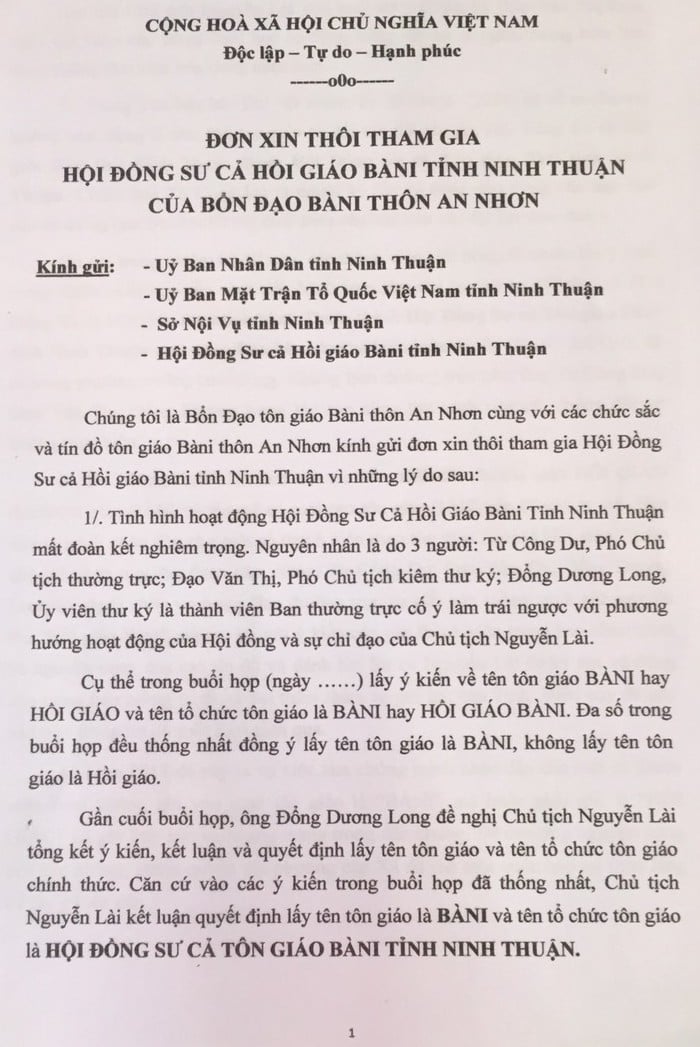 Hình 6. Đơn xin thôi tham gia HĐSC của bổn đạo An Nhơn (trang 1).