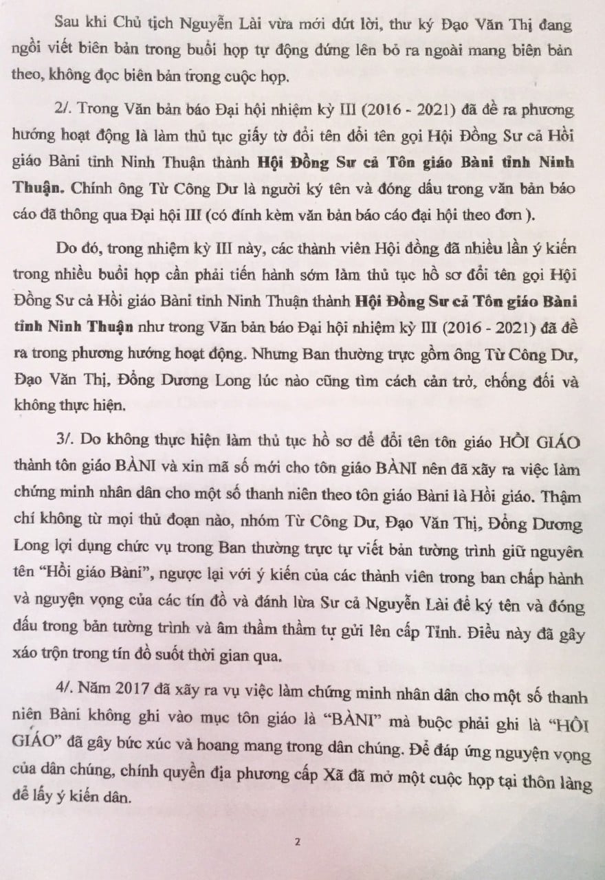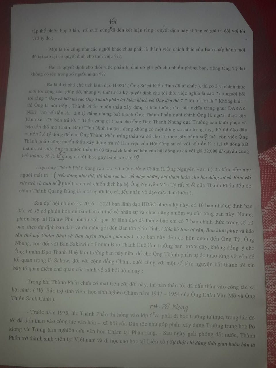 Trở lại câu chuyện, Ts.Thành Phần cầm đầu băng nhóm tự xưng bô lão trí nhân sĩ Chăm, bịa đặt vu khống tổ chức Hội đồng Sư cả Hồi giáo Bani tỉnh Ninh Thuận và đề nghị tổ chức này xóa bỏ từ Hồi giáo ra khỏi tên tổ chức. Đây là câu chuyện hi hữu chưa từng có tiền lệ một Tiến sĩ Chăm cầm đầu khơi mào lôi kéo tín đồ Bani tạo thành nhóm đối nghịch và tuyên truyền phản đạo chống tầng lớp giáo sĩ (Po Gru, Imam, Katip, Acar).