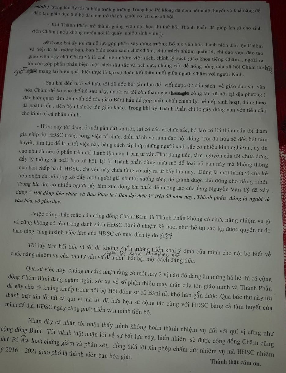 Thành Phần năm nay đã về hưu, cổ nhân có câu: “Cọp chết để da, người ta chết để tiếng”. Nhưng Thành Phần chết đi để “tiếng” hay là để lại “tai tiếng”: Tai tiếng vì sống không có đạo đức, hiềm thù người Chăm đồng tộc, khinh thường người khác kể cả các bậc giáo sĩ (Po Gru, Imam, Katip, Acar). Thành Phần đừng quên rằng Hội Đồng Sư Cả Hồi giáo Bani là cơ quan tối cao đại diện tinh thần cho người Chăm Bani Awal. Một khi đã bị Hội Đồng Sư cả Hồi giáo Bani bất tín nhiệm, thế thì Thành Phần sẽ sống với ai đây? Làm sao Thành Phần có thể ngưỡng đầu để vào thánh đường sinh hoạt với các giáo sĩ như xưa nữa? Còn đâu là mặt mũi để nói chuyện với bà con Chăm một khi Thành Phần bị Hội Đồng Sư Cả loại ra khỏi cộng đồng. Đây là bản án vô cùng nhục nhã đối với một vi trí thức Chăm chưa từng xảy ra trong lịch sử của dân tộc này.