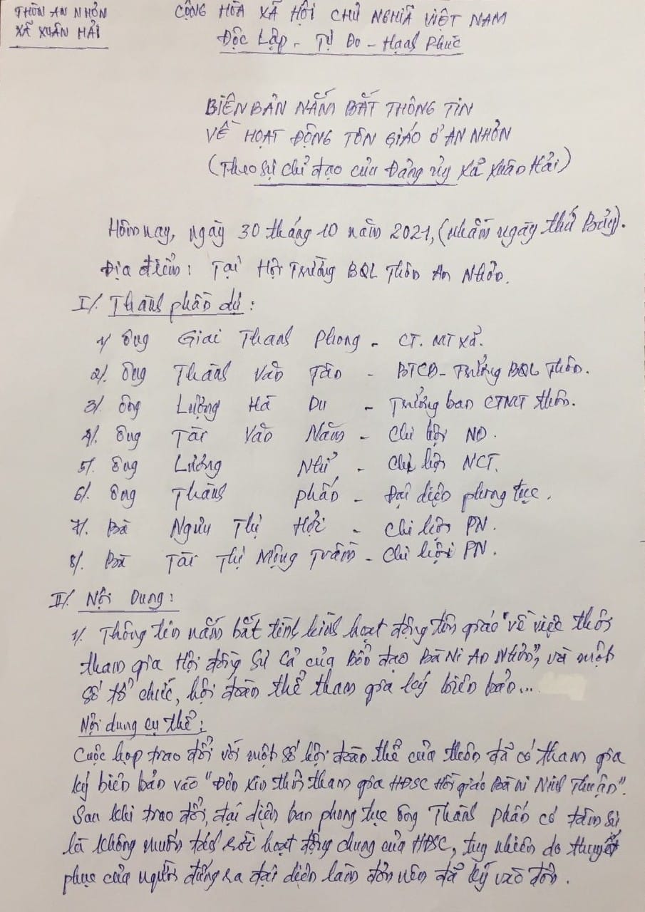 Hình 4. Biên bản nắm bắt thông tin về hoạt động tôn giáo ở An Nhơn (trang 1).