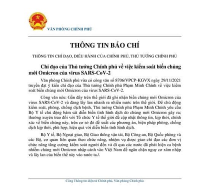 Thông cáo ghi rõ: Gần đây trên thế giới ghi nhận biến chủng mới Omicron của virus SARS-CoV-2 và đang lây lan nhanh ra nhiều các nước trên thế giới. Để chủ động kiểm soát phòng, chống dịch bệnh, Thủ tướng Phạm Minh Chính yêu cầu Bộ y tế chủ động bám sát diễn biến tình hình dịch do chủng mới Omicron gây ra; thường xuyên trao đổi với Tổ chức y tế thế giới để cập nhật thông tin kịp thời chính xác về biến chủng này, trên cơ sở đó đề xuất phương án phòng, chống dịch kịp thời phù họp hiệu quả với diễn biến tình hình dịch.