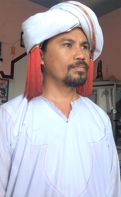 Hình 94. Giáo sĩ Chăm Awal luôn đội chiếc mũ "Kalah Aia" bên trong và "Khăn Jram" bên ngoài.