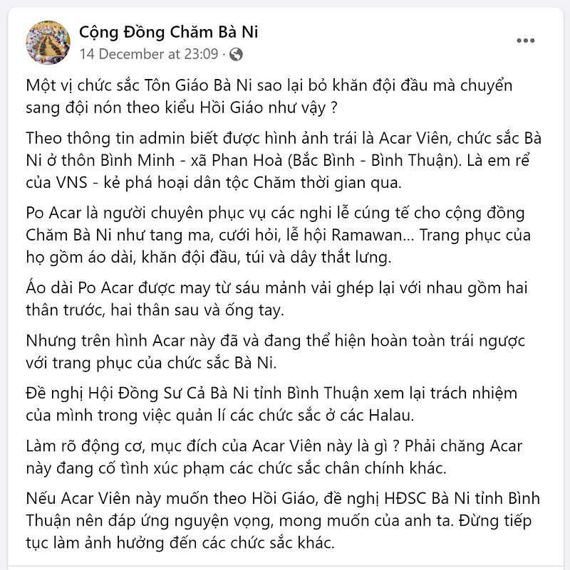 "Theo thông tin admin biết được hình ảnh trái là Acar Viên, chức sắc Bà Ni ở thôn Bình Minh - xã Phan Hoà (Bắc Bình - Bình Thuận). Là em rể của VNS - kẻ phá hoại dân tộc Chăm thời gian qua.