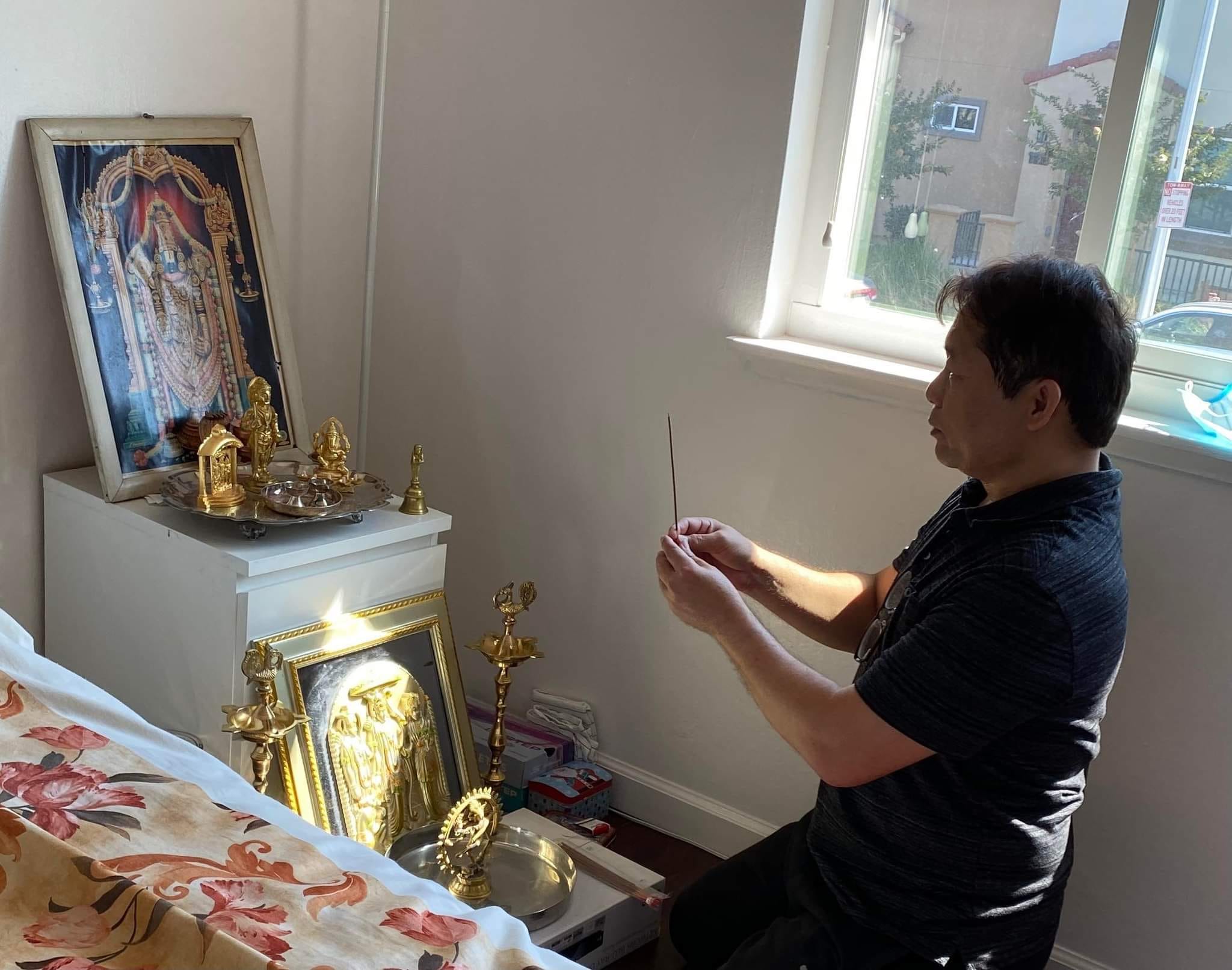 Hình 1. Putra Podam đốt nhang cấm bàn thờ thần Shiva của Ấn Độ giáo.
