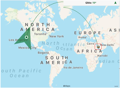 Hình 5. Hướng Kiblat, Makkah lệch 19 độ Bắc, Định vị tại Los Angeles-California-America.