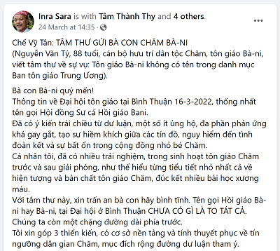 Ngày 24/3/2022 lúc 14:35 trên Facebook Inra Sara có đăng bài viết: "Chế Vỹ Tân: TÂM THƯ GỬI BÀ CON CHĂM BÀ- NI”. Bài viết phản ánh không đúng về cái gọi là tôn giáo "Bani"đã bị xóa khỏi danh mục tôn giáo ở Việt Nam.