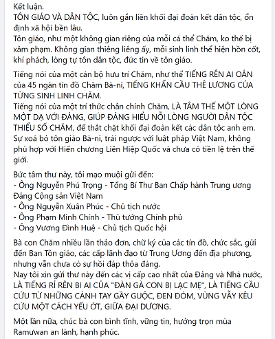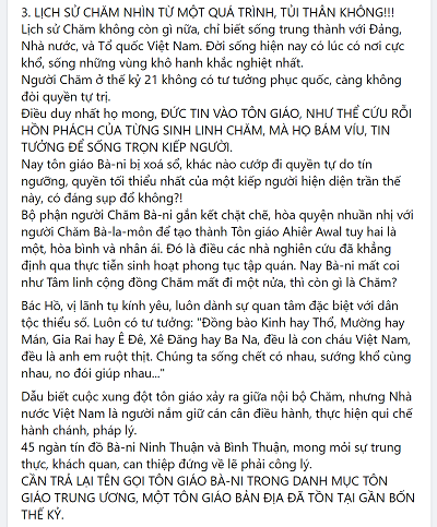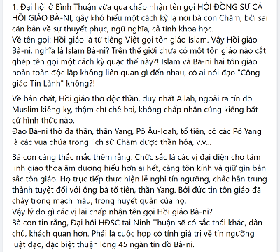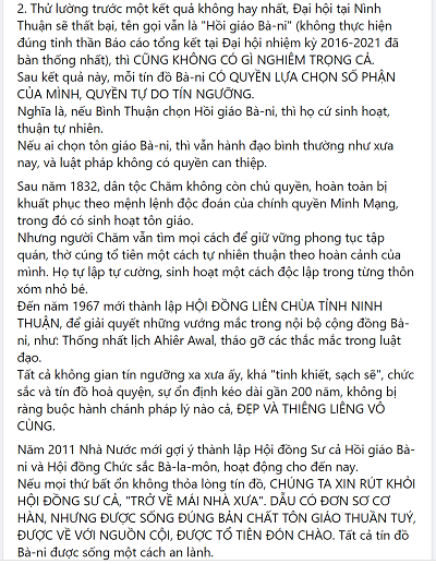 “Thông tin về Đại hội tôn giáo tại Bình Thuận 16-3-2022, thống nhất tên gọi Hội đồng Sư cả Hồi giáo Bani. Đã có ý kiến trái chiều từ dư luận, một số ít ủng hộ, đa phần phản ứng khá gay gắt, tạo sự hiềm khích giữa các tín đồ, nguy hiểm đến tình đoàn kết và sự bất ổn trong cộng đồng nhỏ bé Chăm. Cá nhân tôi, đã có nhiều trải nghiệm, trong sinh hoạt tôn giáo Chăm trước và sau giải phóng, như thể hiểu từng tiểu tiết nhỏ nhất cả về hiện tượng và bản chất tôn giáo Chăm, đúc kết nhiều bài học xương máu.”