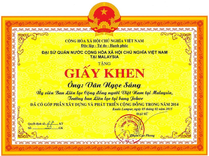 Hình 3. Ts. Putra Podam, một trong tám giấy khen do Ngài Phạm Cao Phong, Đại sứ đặc mệnh toàn quyền nước Cộng hòa xã hội chủ nghĩa Việt Nam tại Malaysia cấp.