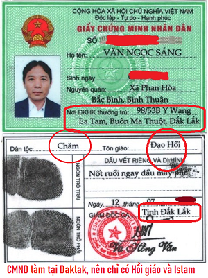 Hình 1. Chứng minh nhân dân (CMND) của Văn Ngọc Sáng, dân tộc: Chăm, tôn giáo: Đạo Hồi, do Công an Daklak cấp.