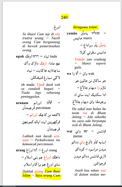 6. Tự điển Kamus Melayu - Cam (2012), định nghĩa: Cam Bani Islam: Saya orang Cam beragama Islam