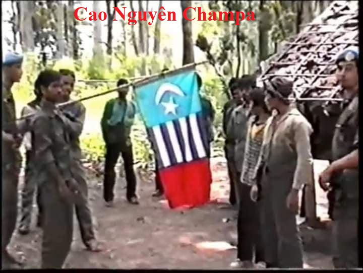 Hình 9. FULRO và Hiệu kỳ Mặt trận 1 giải phóng Cao Nguyên Champa tại biên giới Tây Nguyên-Campuchia. Dân quân FULRO tại Cao Nguyên vẫy cờ Hồi giáo Cao Nguyên Champa.