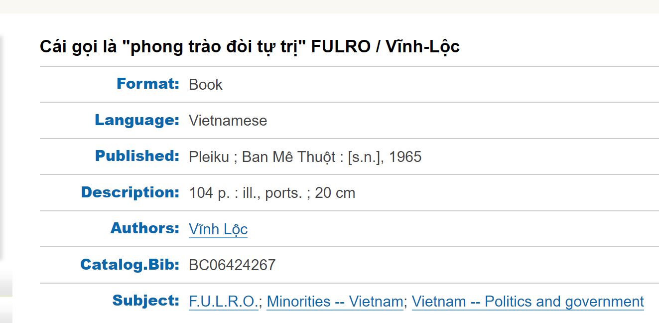 1. Vĩnh Lộc, (1965), "Cái gọi là "phong trào đòi tự trị" FULRO", Pleiku, Ban Mê Thuột.