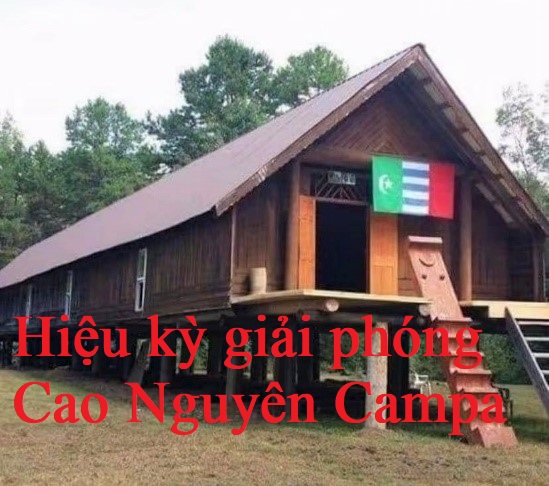 Hình 10. Hiệu kỳ Mặt trận 1 giải phóng Cao Nguyên Champa treo trước nhà Sàn Ede tại buôn Ako Dhong-Daklak.