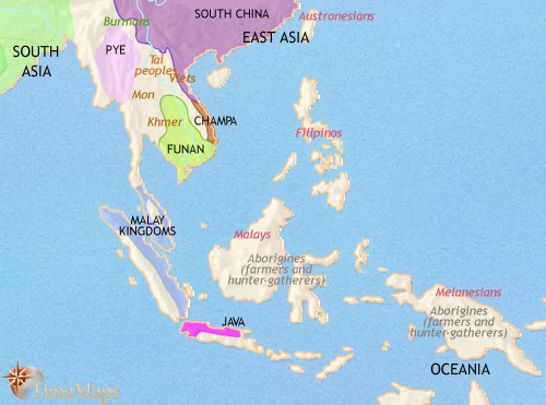 Hình 3. Sources: 500CE các khu vực giao thương, liên kết văn hóa mạnh với Ấn Độ và ảnh hưởng văn hóa trên khắp Đông Nam Á. Phù Nam tổ chức theo mô hình Ấn Độ. Bán đảo Mã Lai phía đông Sumatra và đông Java có nhiều vương quốc nhỏ. 700 TCN triều đại nhà Đường bắt đầu ảnh hưởng Trung Quốc. Thương mại từ Trung Quốc mở rộng mạnh mẽ và sự trỗi dậy của cường quốc hàng hải Sri Vijaya. Vương quốc Champa vẫn là một trung tâm thương mại thịnh vượng. https://sites.google.com/site/group2angkor/the-historical-setting-during-the-khmer-empire.