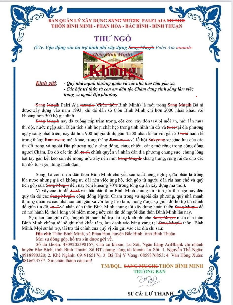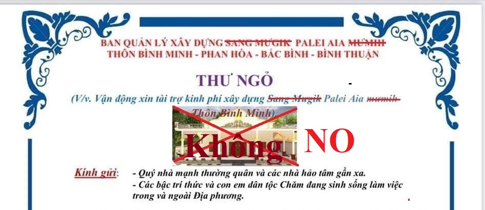 Hình 3. Thư ngõ do ông Vê (Nguyễn Trọng Mường) đăng trên Facebook ngày 14/9/2022, với nhiều lỗi chính tả tiếng Việt và tiếng Chăm.