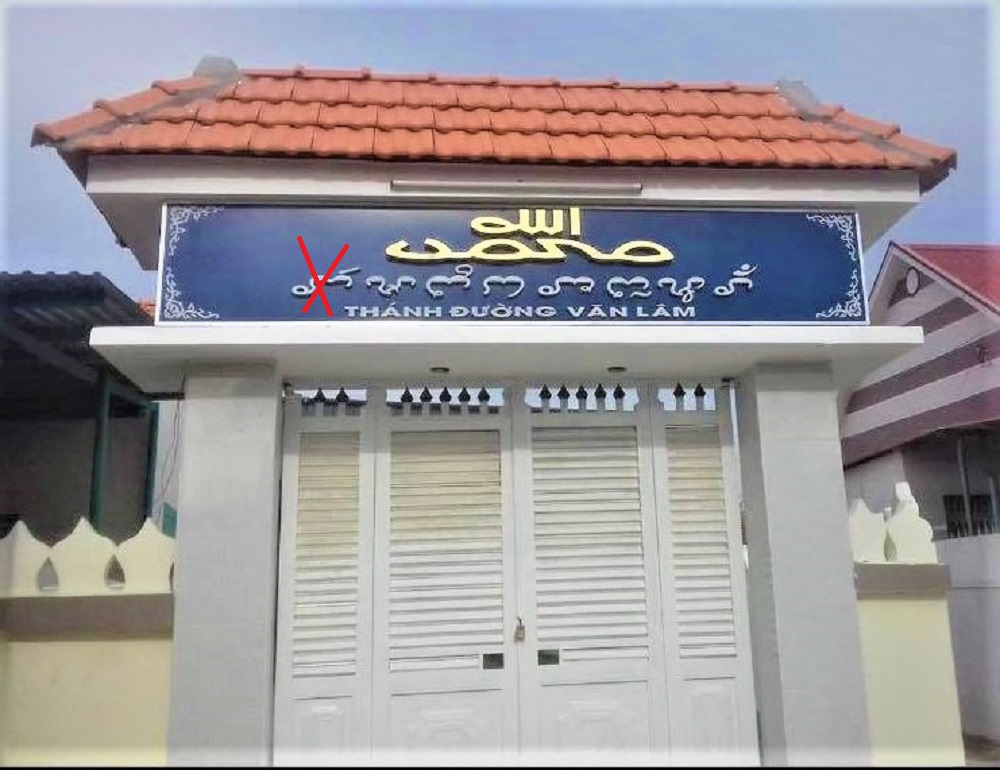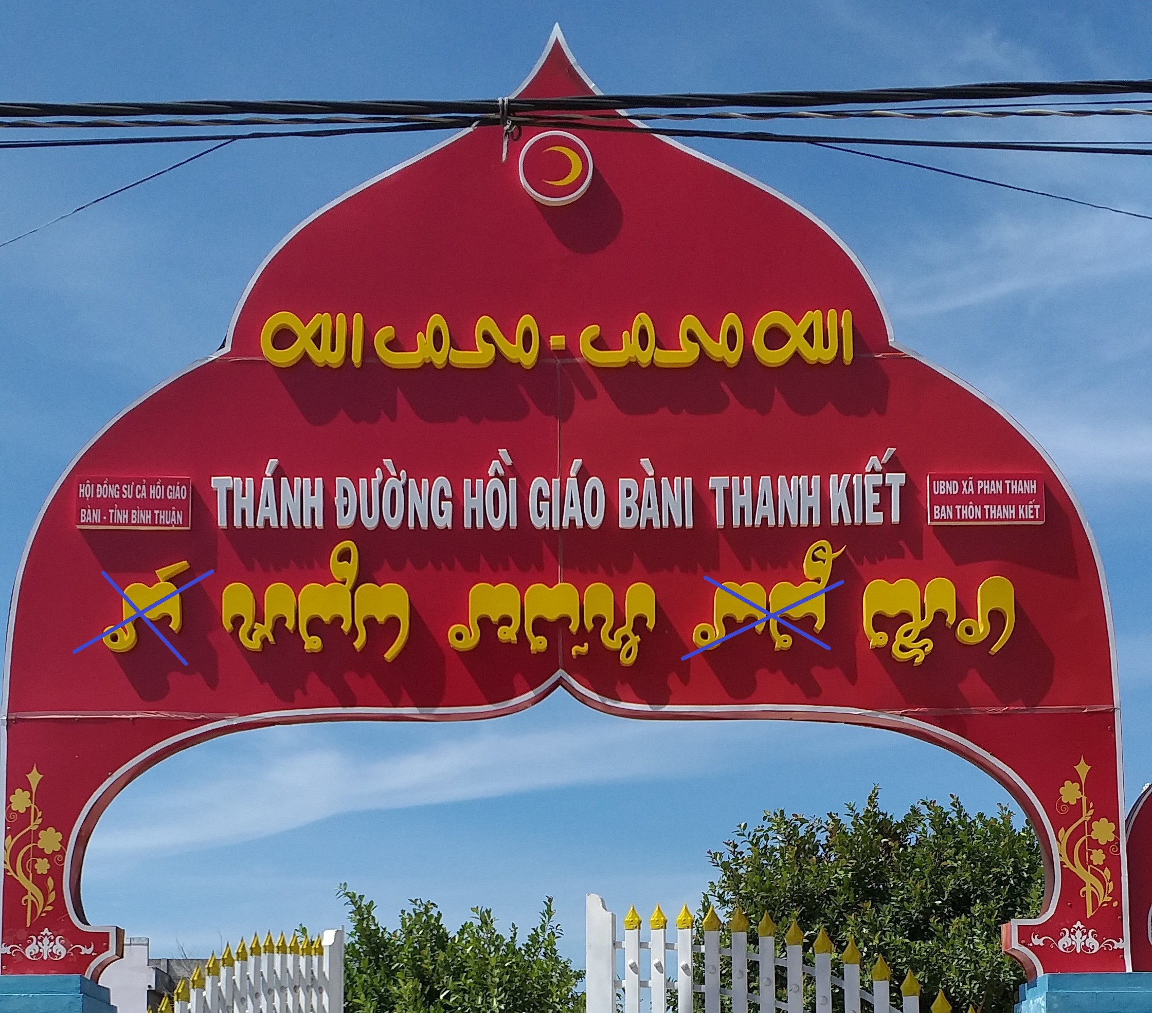 Quan sát trên cổng thánh đường Thanh Kiết, dòng chữ Thrah Chăm ghi như sau: