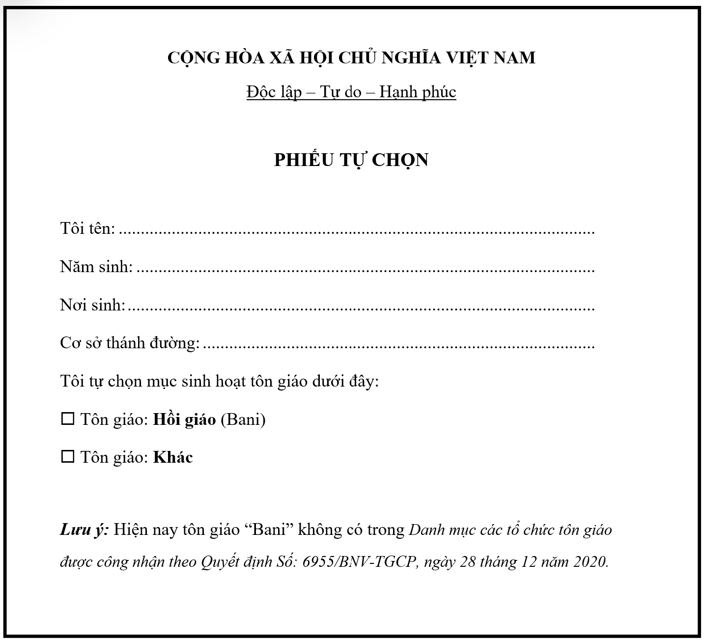 Trên Danh mục Ban Tôn giáo Chính phủ, không có tôn giáo: Bani (Kèm mẫu tại Phụ Lục)