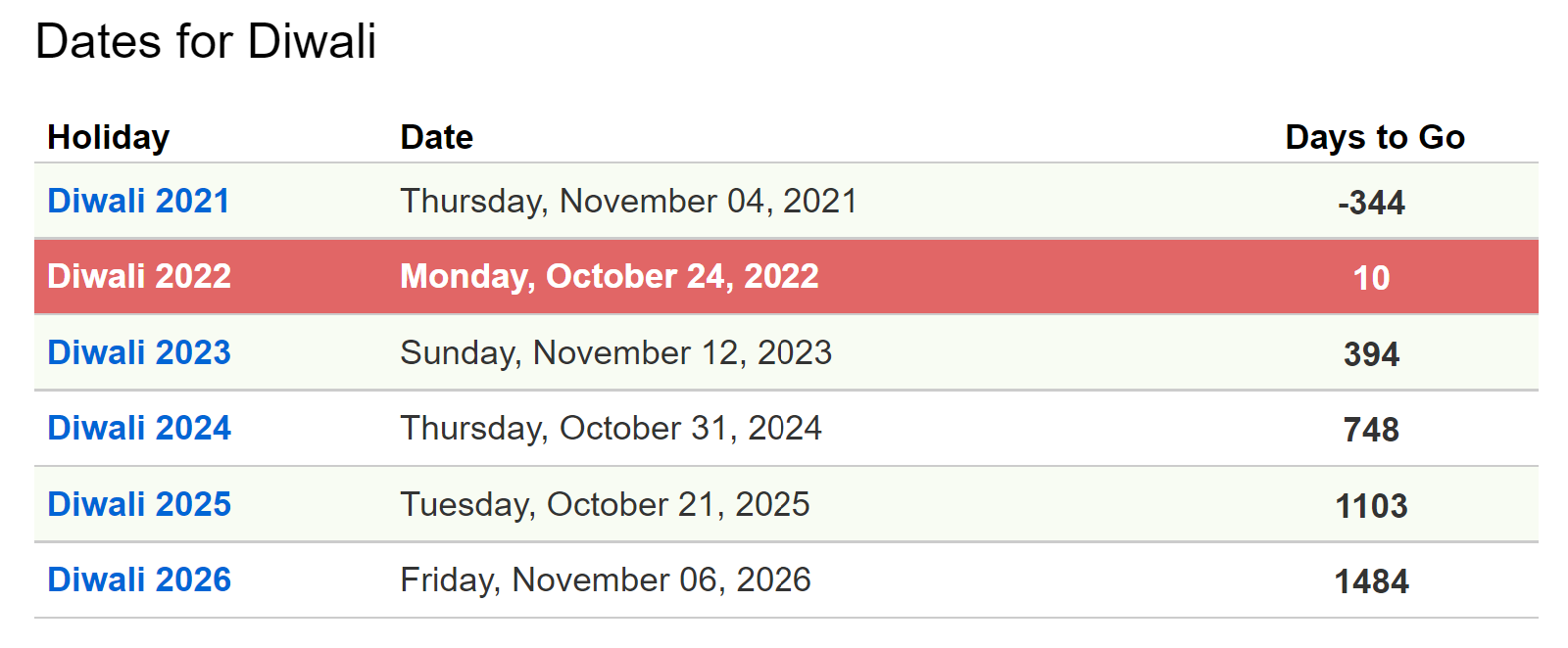 Lễ hội Diwali (Deepawali) năm nay được tổ chức vào thứ Hai ngày 24 tháng 10 năm 2022, lễ hội được kéo dài từ 3 đến 5 ngày tùy theo khu vực.
