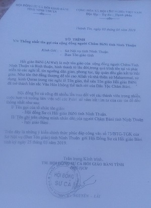 Kính thưa Sở Nội vụ, Ban tôn giáo, hầu hết các chức sắc Chàm không biết chữ, kinh thánh Korran họ đọc theo tiếng Latinh kiểu phiên âm. Các chức sắc Chàm biết và hiểu thì số rất ít. Số này khi lên tiếng nói về tôn giáo thì đều bị cho là âm mưu bán tôn giáo.