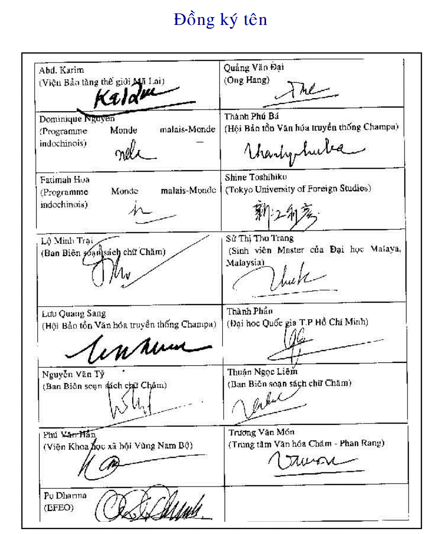 Hình 1. Biên bản Hội thảo ngôn ngữ Chăm mà Nguyễn Văn Tỷ đã ký và phản bội chữ ký.