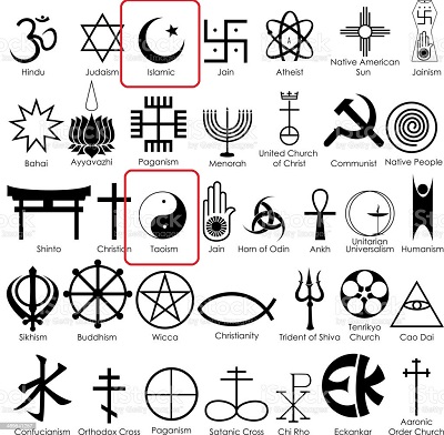 Hình 28. Một số biểu tượng tôn giáo trên thế giới, trên Thánh đường Bình Minh hiện nay bị gắn Âm-Dương (Yin-Yang)