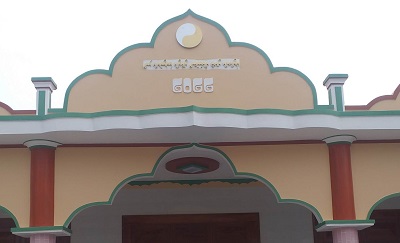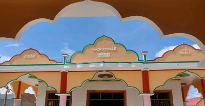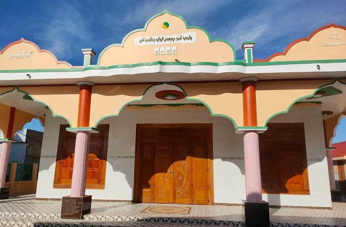 Hình 26. Mặt chính của Thánh đường thiết kế ba Kubah giả, Kubah bên trái ghi chữ Thrah Chăm, Kubah bên phải ghi chữ Ả Rập, và Kubah chính giữa ghi chữ Ả Rập: الله - محمد (Allah-Muhammad) và chữ Thrah ở dưới ghi: 2022.
