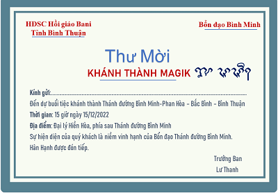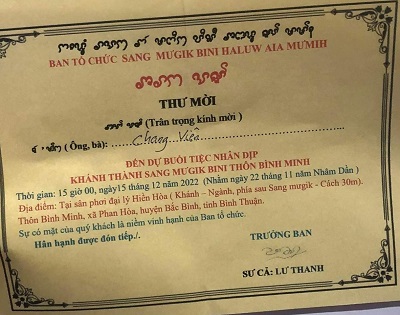 Hình 33. Được biết việc xây Thánh đường (Magik) chưa báo cáo hoàn thành lên tổ chức Hội đồng Sư cả, Sở Nội vụ hay cấp liên quan mà Chính quyền thôn Bình Minh vội vàng tổ chức khánh thành vào ngày 15/12/2022. Đặc biệt trên giấy mời không ghi tên tổ chức quản lý Bổn đạo Bình Minh là HĐSC tỉnh Bình Thuận, đây là âm mưu chính của ông Imam Vê (Nguyễn Trọng Mường) cấu kết với Đảng viên về hưu để chống HĐSC.