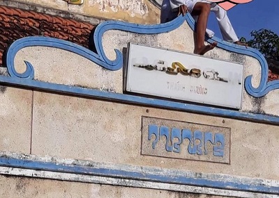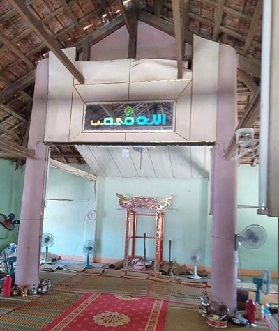 Hình 27. Nhóm đòi tôn giáo Bani đập bỏ chữ Ả Rập: Allah-Muhammad trên Thánh đường để chèn dòng chữ Thrah Chăm "Sang Magik Bini Haluw Aia Mamih" đồng thời bổ sung thêm biểu tượng Âm-Dương Bát quái