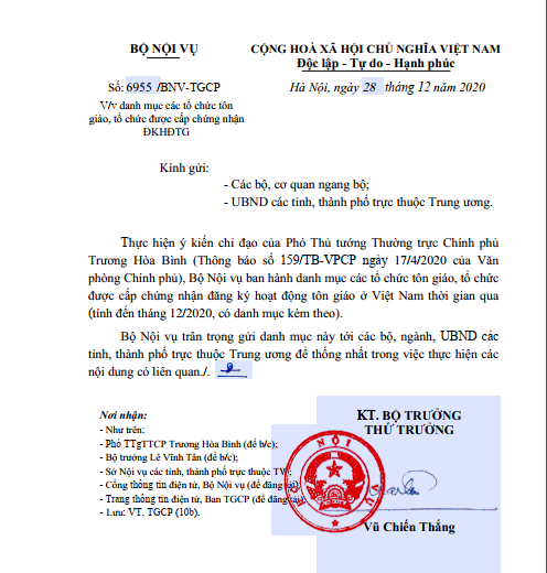 Hình 48. Theo Công văn số: 6955/BNV-TGCP ngày 28 tháng 12 năm 2020 củaBộ Nội vụ, số thứ tự (6) là tôn giáo Hồi giáo, tên tổ chức: Hội đồng Sư cả Hồi giáo Bani.