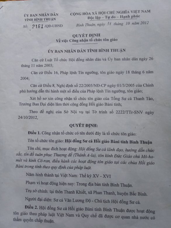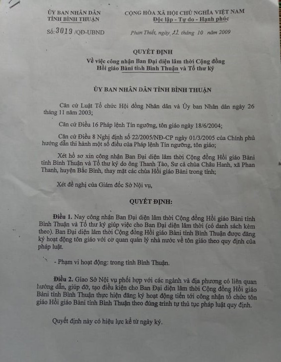 Một số quyết định công nhận từ Ban Đại diện lâm thời Cộng đồng Hồi giáo Bani tỉnh Bình Thuận theo quyết định số: 3019/QĐ-UBND ngày 22 tháng 10 năm 2009 do Sư cả (Guru Tào) làm Trưởng ban như Hình 33.