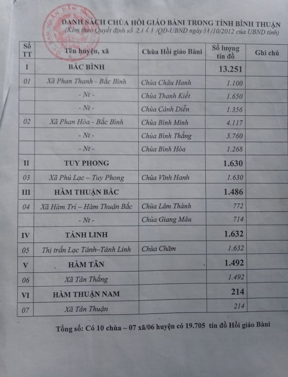 Hình 41. Danh sách Thánh đường (Magik) Hồi giáo Bani trong tỉnh Bình Thuận theo Quyết định 2161/QĐ/UBND của tỉnh Bình Thuận ngày 31 tháng 10 năm 2012.