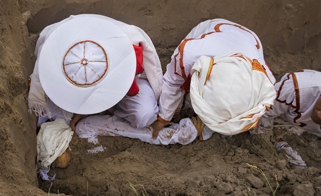 Hình 230. Bốn giáo sĩ Acar ngồi hai bên quan tài để khiêng đến khu mộ. Ảnh: Internet.