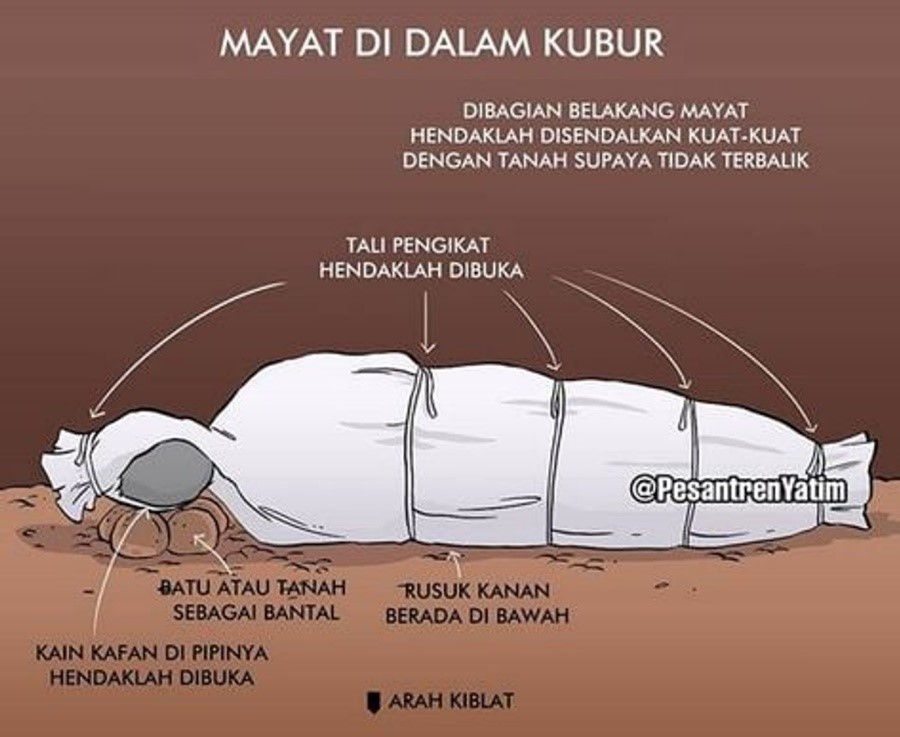 Tại khu mộ huyệt được đào theo hướng Bắc - Nam, sâu khoảng 1,5m và ngôi mộ phải vuông gốc với hướng Makkah (Mecca). Sau đó 3 Acar xuống huyệt làm nghi thức, và tử thi được mặc áo Luak, váy xà rông (khen), bên ngoài quấn thêm một lớp khăn vải trắng, thi hài đưa xuống ngôi mộ từ từ và không có quan tài, đầu hướng Bắc, chân hướng Nam, tử thi nằm nghiêng bên tay phải, mặt và ngực quay về hướng mặt trời lặn (hướng Tây, ở Việt Nam hướng Tây trùng hướng thánh địa Makkah) như đang hành lễ. Trong thời gian thi hài được đưa xuống huyệt mộ, đọc nội dung sau Hình 232, trích từ Kinh sách Bani