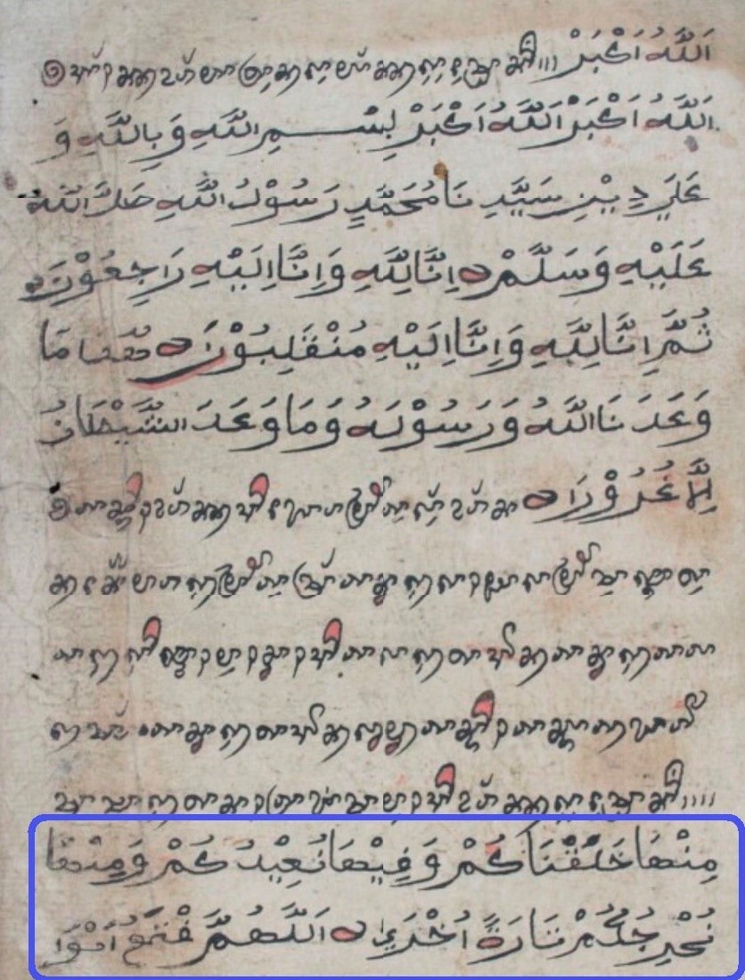 “Từ nó (đất này) Ta (Allah) đã tạo các ngươi ra, Ta sẽ đưa các ngươi trở về trong nó và Ta sẽ đưa các ngươi ra khỏi nó một lần nữa (vào ngày phục sinh). Ôi Allah! Xin Ngài mở các cánh cửa của bầu trời cho linh hồn này và nới rộng cho người này trong phần mộ của mình và thấp sáng cho người này trong đó bằng sự khoan dung của Ngài; Ôi Đấng Khoan Dung Ưu Việt!”