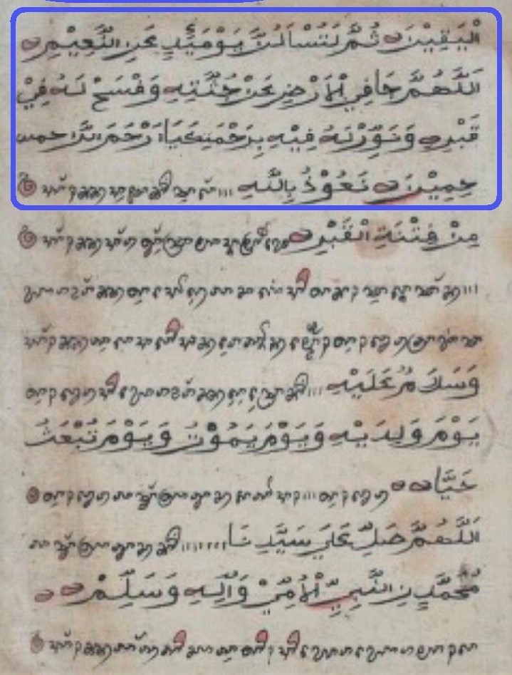 “Hỡi bề tôi của Allah (người chết)! Hãy nhớ giao ước mà bạn đã thừa nhận khi ra đi khỏi thế giới này để hướng đến ngôi nhà Ngày sau; bạn đã ra đi khi bạn chứng nhận rằng không có thần linh nào ngoại trừ Allah và chứng nhận rằng Muhammad là Sứ giả của Allah, chứng nhận rằng thiên đàng là sự thật, hỏa ngục là sự thật, cầu Sirat là sự thật, cái cân Mizan là sự thật, phục sinh là sự thật, giếng/hồ nước Haudh là sự thật, sự can thiệp Shafa’ah (của Nabi) là sự thật, Thiên thần Munkar và Thiên thần Nakir và chất vấn của họ là sự thật, giờ tận thế sẽ diễn ra mà không có bất cứ sự nghi ngờ nào, Allah sẽ làm sống lại (phục sinh) những người trong phần mộ”